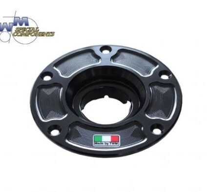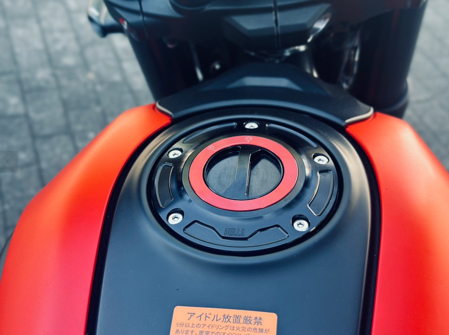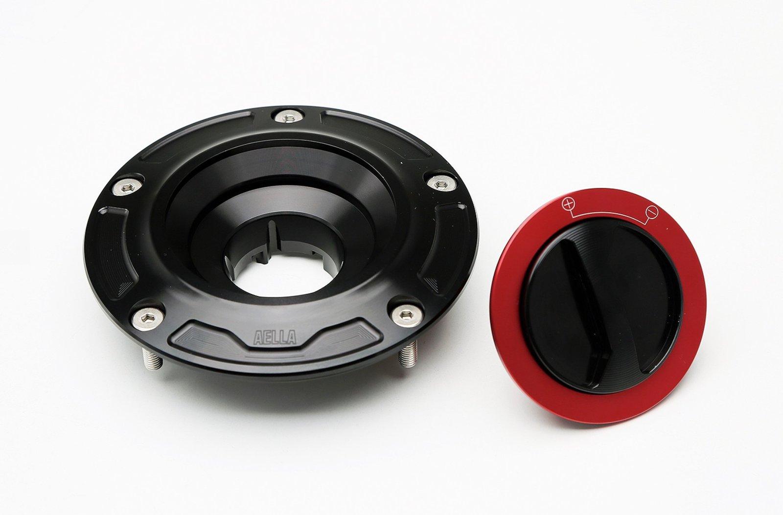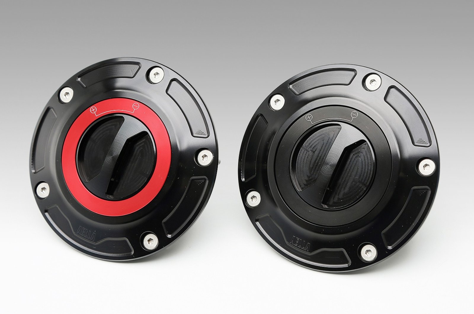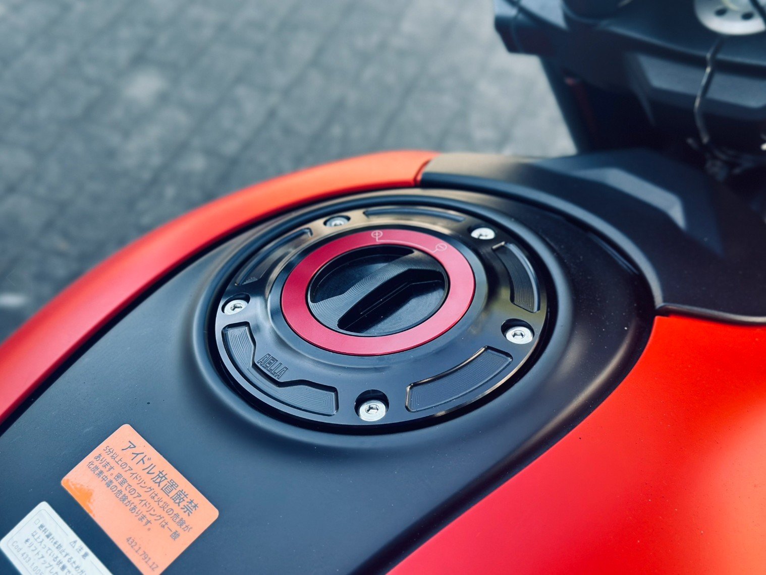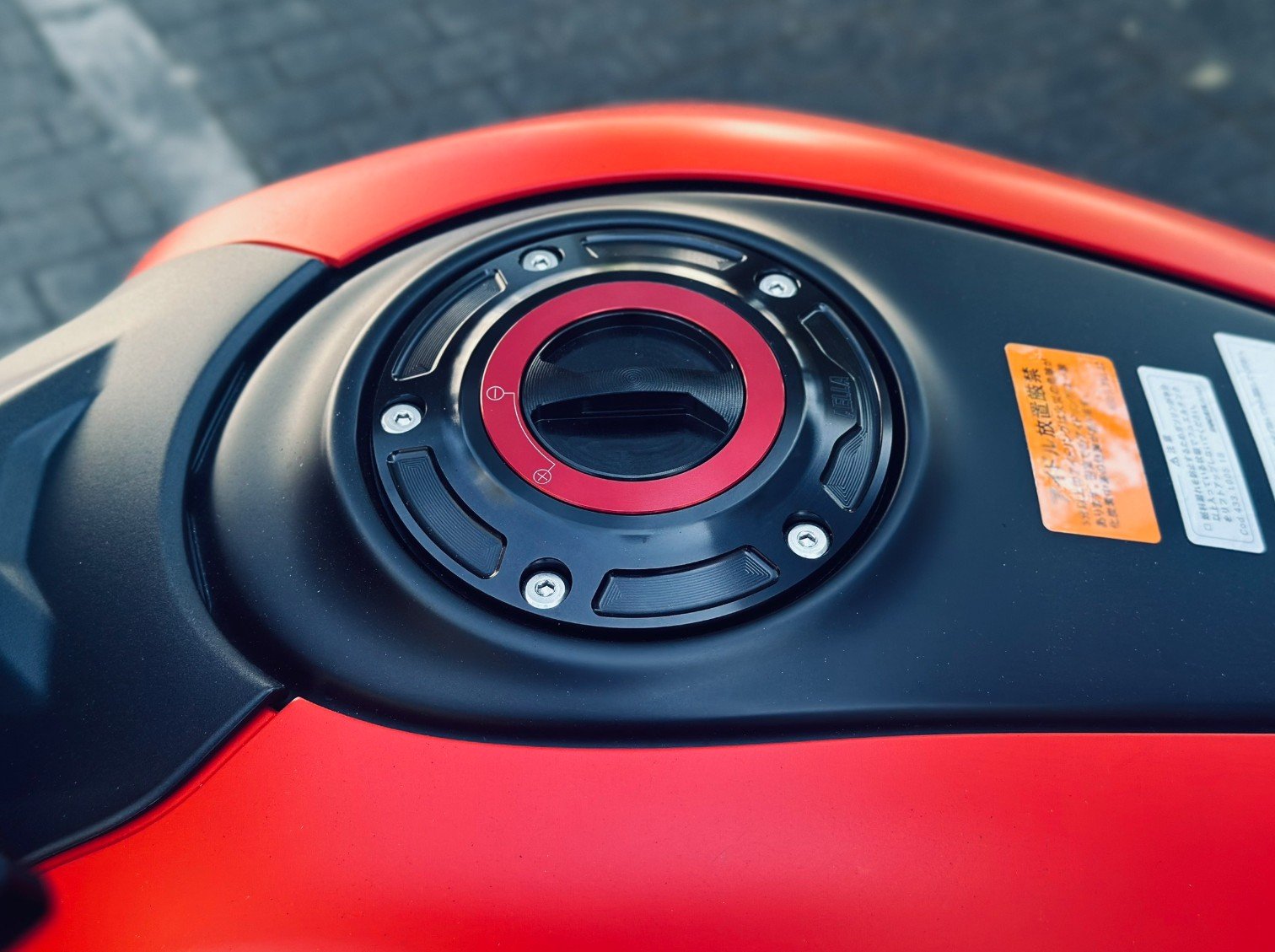 This is a fuel tank cap (gasoline filler cap) made of machined aluminum. By replacing the standard tank cap, it can be easily opened and closed without using a key, allowing for quick refueling. It is very convenient for use on the circuit as well as on public roads.