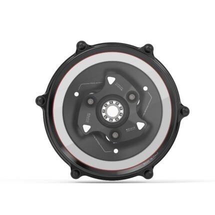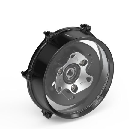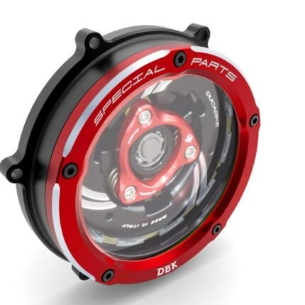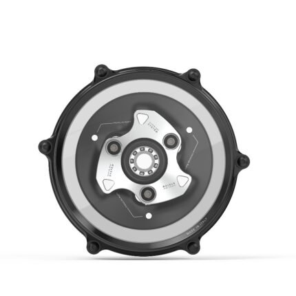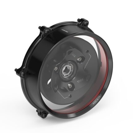 Clear oil bath clutch cover for Ducati Panigale V4, made in light alloy, machined from solid and then anodized. Transparency is obtained with a panel Lexan, resistant to shock and temperatures, while the watertightness is guaranteed by a specific O-ring.