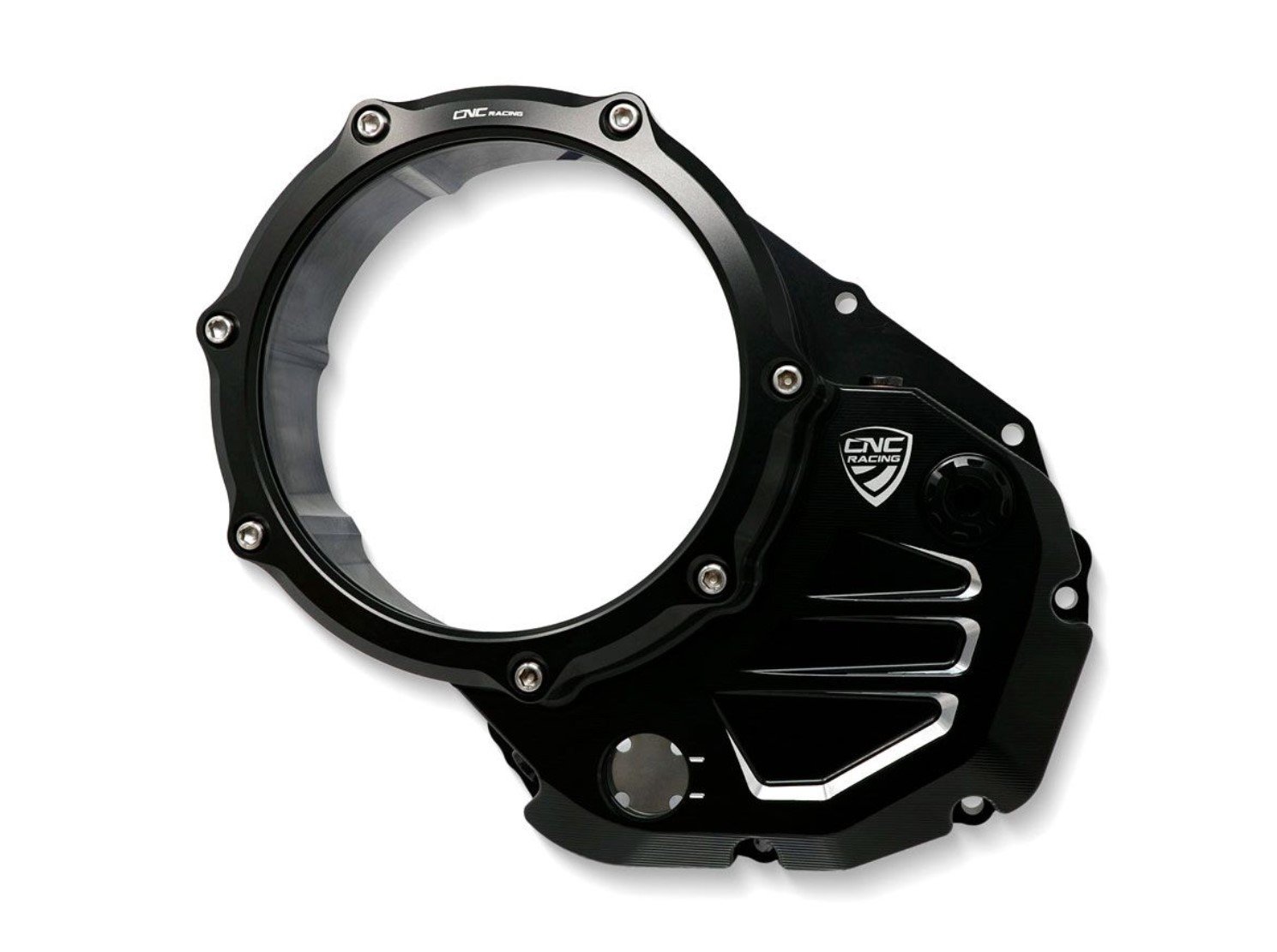Transparent carter for Ducati oil clutches made in machined aluminum.Ā Transparency is obtained with a Lexan sheet resistant to shocks and temperatures, whose hydraulic seal is guaranteed by the use of a specific o-ring.