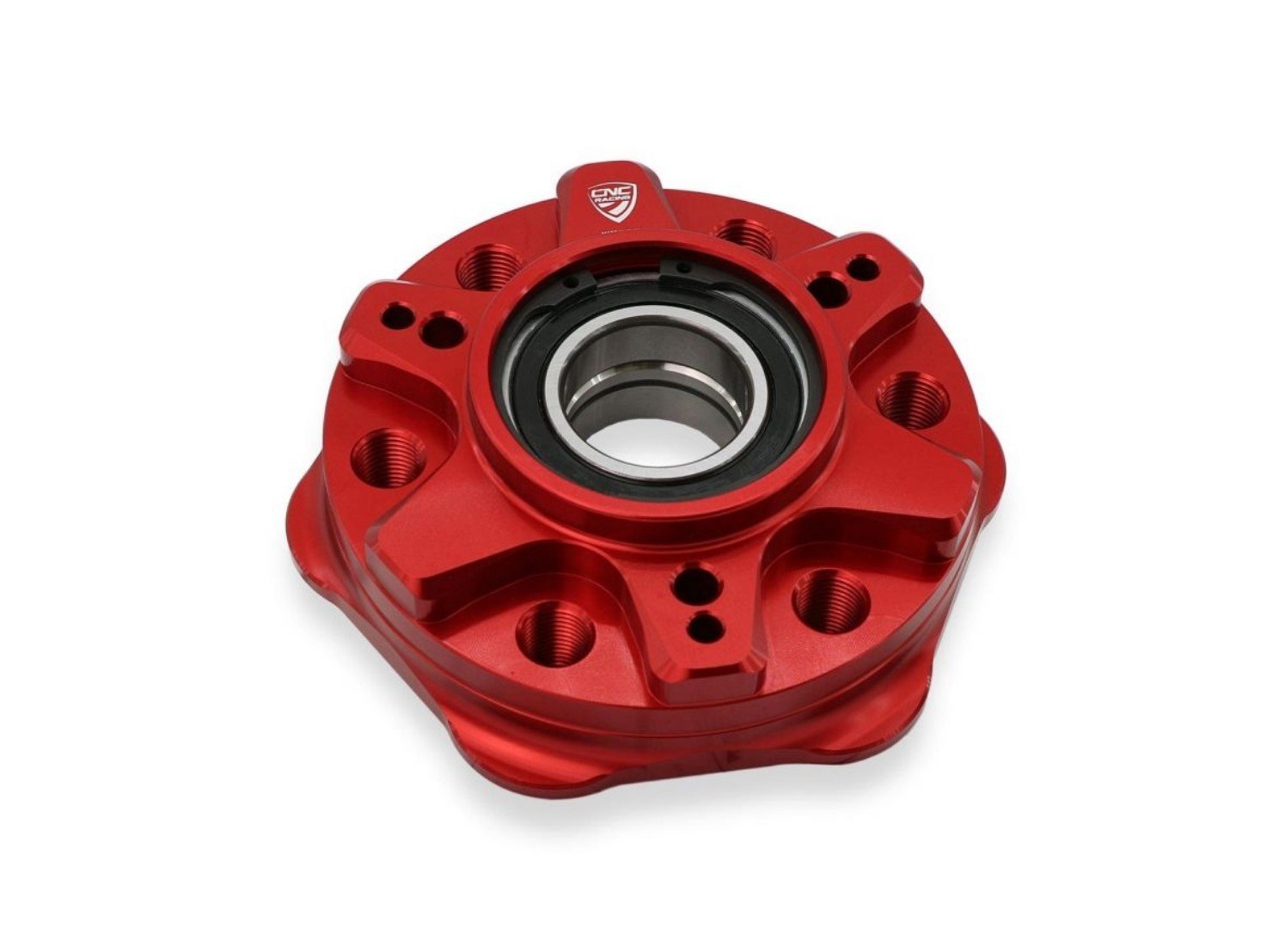 Sprocket holder flange machined from solid light alloy with subsequent colored anodizing surface treatment.Ā The product is supplied with new bearings and bushings already mounted for quick and easy replacement of the original hub.