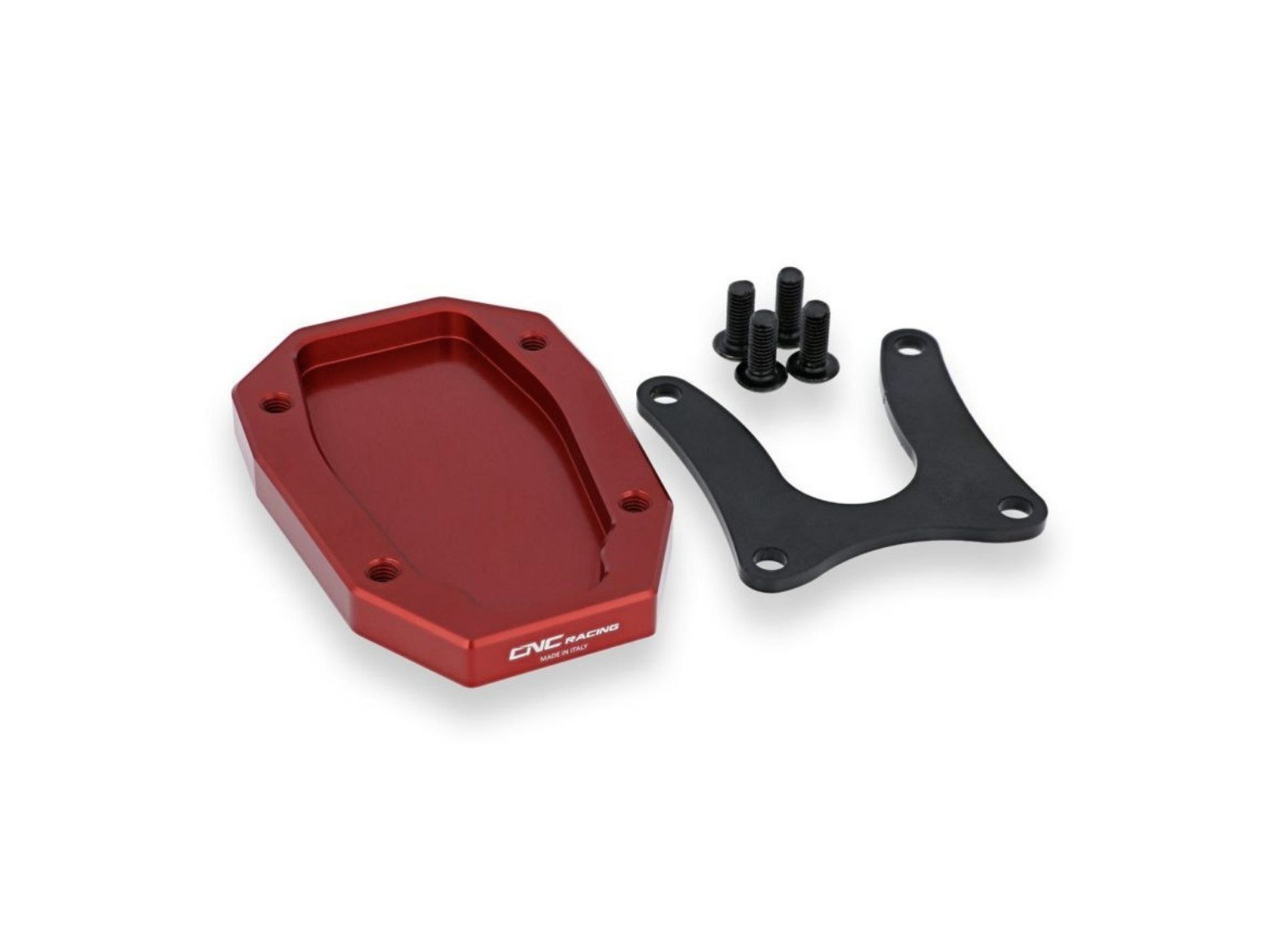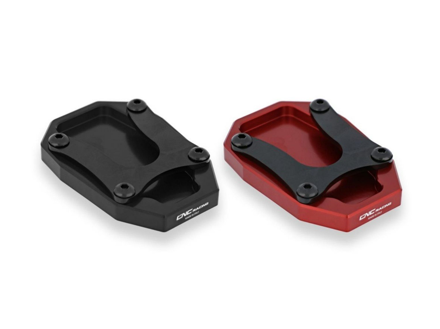 Stand support base made from solid light alloy with subsequent surface anodization.Ā Designed to widen the support surface of the original side stand and make the bike safer when parked.Ā The upper stop is made of S235JR steel to ensure maximum durability.Ā Supplied already assembled with screws having a black zinc-plating treatment to give aesthetic uniformity.