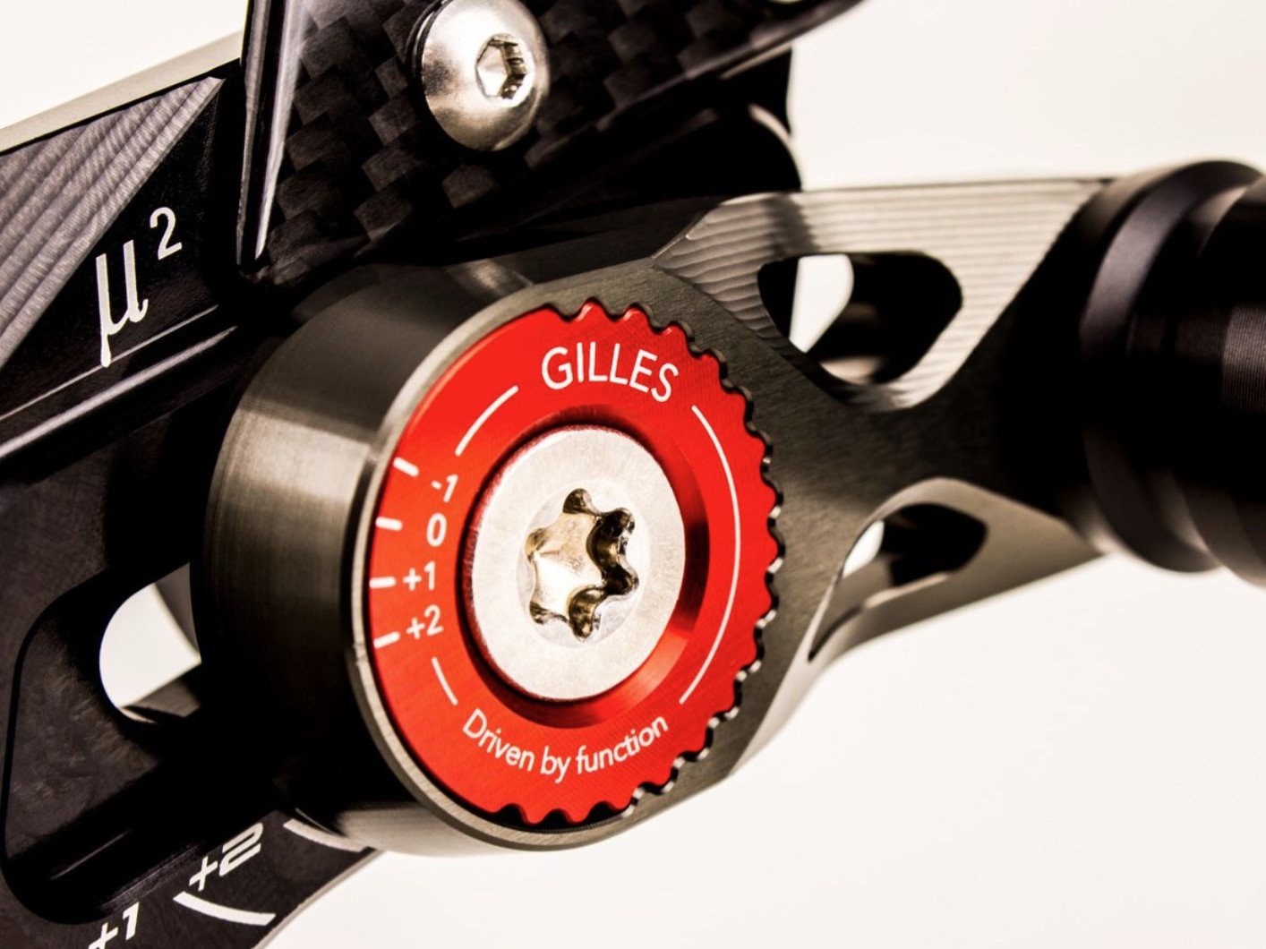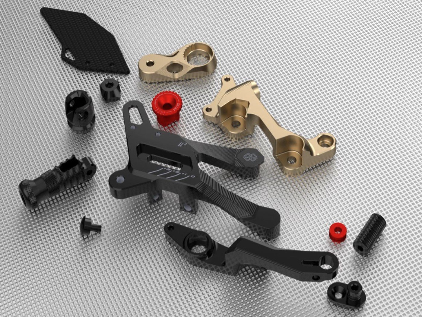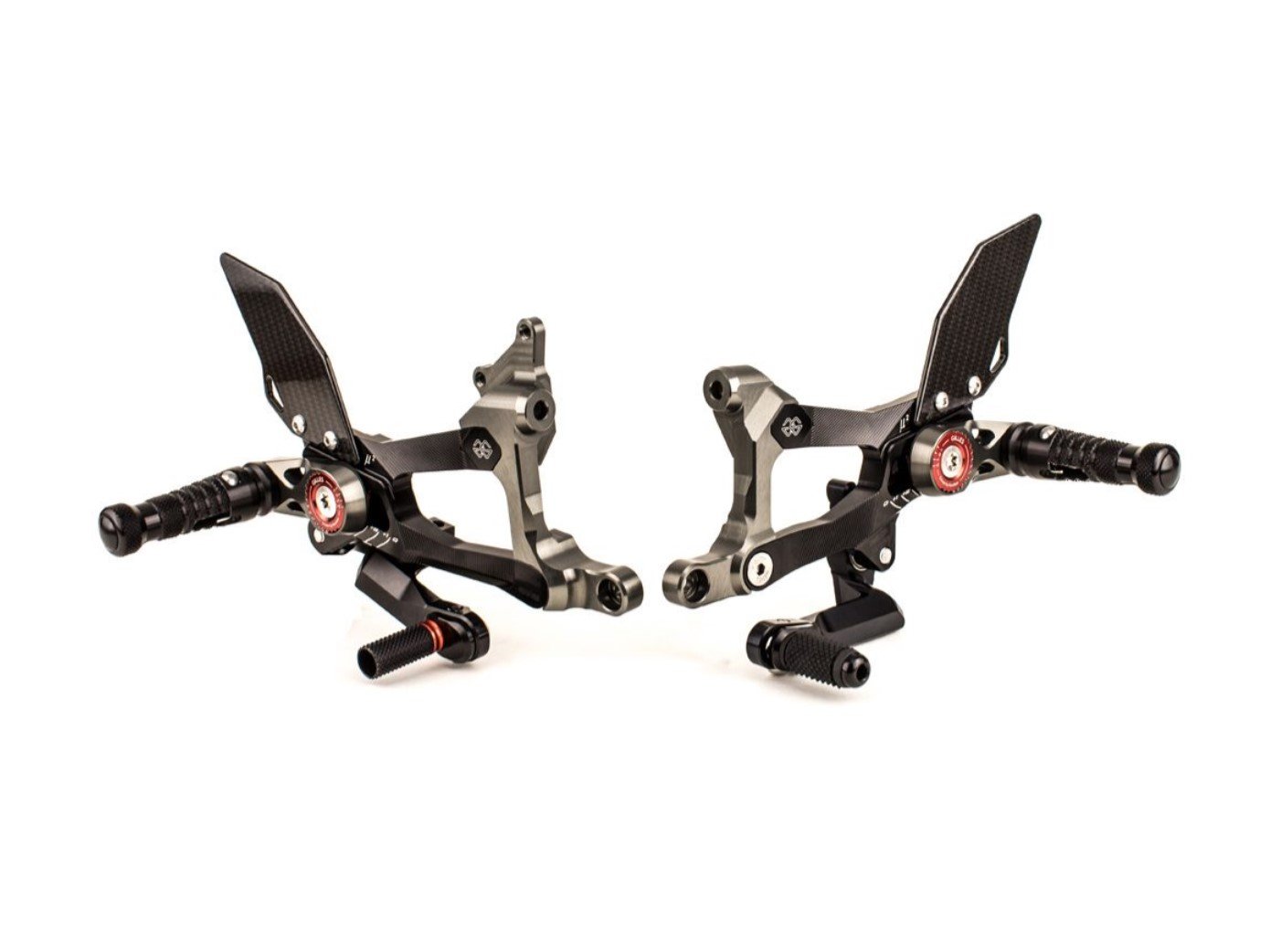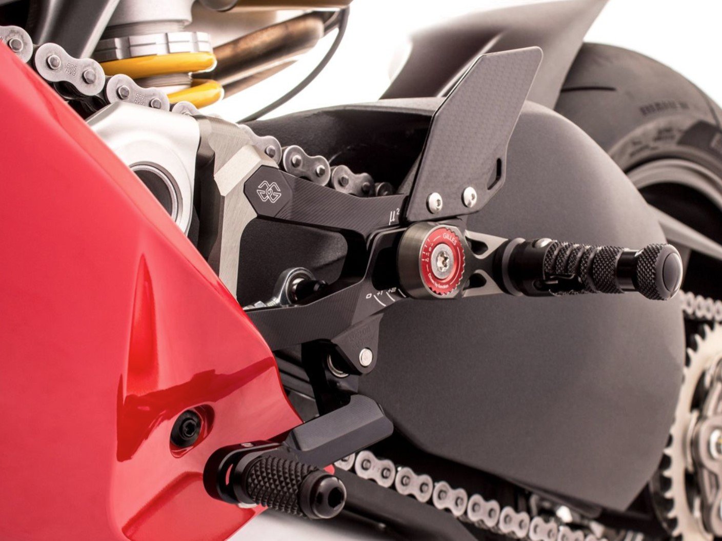 A completely new generation of rear set systems.Ā The MUE2 combines futuristic design with the highest quality workmanship and significantly easier foot plate position adjustment.Ā Black anodized with contrasting color adjusters, which combine sportiness and aggressiveness in a single product.Ā The positions of the footpegs and levers, brake and gearshift, can be freely adjusted according to your personalization criteria.Ā The footrests are positioned using a combination of sliding and rotating adjustments in a single point, making them extremely simple to modify.Ā The footrests also provide the possibility to leave the standard gearbox or to reverse it to satisfy every type of need.Ā The brake and shift levers can be easily adjusted to suit your driving needs.Ā The heel guards are fully carbon on both sides that define the design of the Gilles Tooling rear sets.