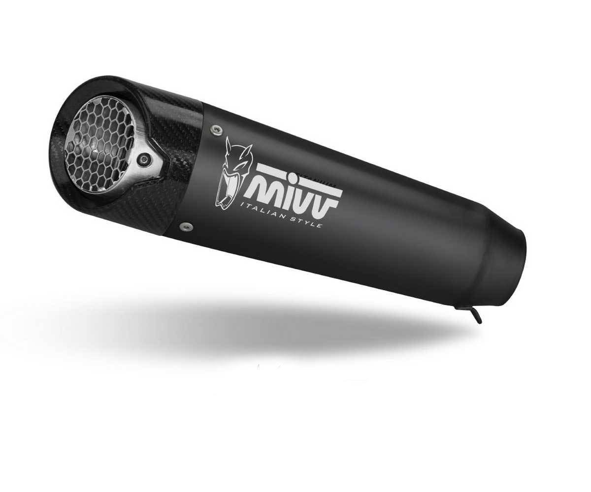Made to improve the aesthetics, sound and performance of the motorcycle, the Mivv slip-on exhaust comes from the utmost attention to design, with the aim of satisfying those who want to stand out, even through the look of their bike.Ā The Mivv X-M5 line, the result of the experience acquired in the MotoGP, Moto2 and Moto3 world championships, is the perfect synthesis between racing style and performance.Ā With a design inspired by the exhausts made for the MotoGP world championship, the X-M5 muffler has a conical shape and compact dimensions capable of releasing the captivating MIVV sound.Ā It features a 3K twill carbon end cap and is equipped with a removable protective grille that hides the dB-killer.Ā The Black version is characterized by a central body in black 304 stainless steel with a “Black Moon” effect, a finish obtained thanks to a special ceramic-based painting process.