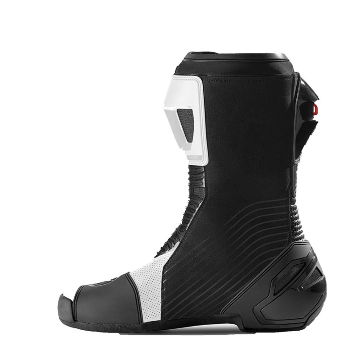 Inclined internal heel for perfect adhesion to the motorcycle footrest.